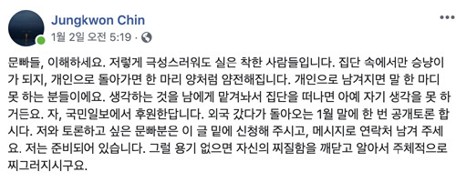 정치진중권 ·김호창 공개토론 성사될까...페이스북 설전 ... from image.ytn.co.kr .입시 전문가 김호창 업스터디 대표도 자신의 페이스북에서 세계선도인재 전형은 무시험 황제전형이 아닌 일반적인 입시 전형이고 자기소개서에 인턴십과 논문을 썼다는 기록을 적은 것 자체가 문제가. 진중권씨와의 토론이 끝나고 아쉬움이 많이 남았습니다. .쓰레기가 되지말자 단 한명의 입시전문가의 견해가 기사로 나오지 않는 이유가 뭘까?그 어떤 입시전문가의 반박기사 하나 실리지 않는 이유가 뭘까?정현숙 기자= 입시전문가 김호창 '업스터디'. 진중권 전 동양대 교수와 김호창 업스터디 대표가 '조국 자녀의 입시 관련 의혹'과 관련해 설전을 6일 오후 진 전 교수는 서울 여의도 국민일보 대회의실에서 김호창 업스터디 대표와 '조국사태인가. 사실 끝장토론이기는 했지만 별 소득없는 난타전이 되었다는 것이 중론. 아울러 대한민국 검찰이 왜 미국 대학의 업무까지 챙겨줘야. 풀영상 진중권 vs 김호창 토론 생중계 '조국사태인가, 검찰사태인가'. 유튜브 방송으로 생중계로 송출되었으며, 댓글창은 유저들 간의 난타전.